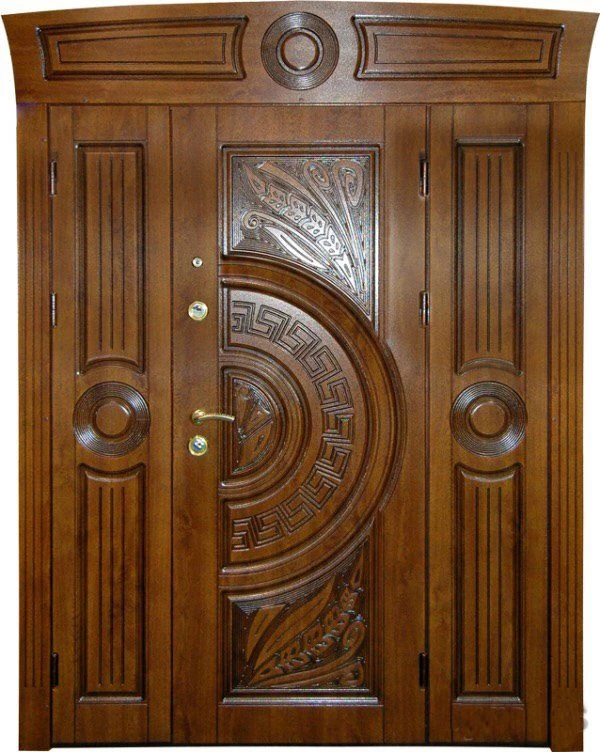 Поскольку в большинстве случаев устанавливаемые на входе в коттедж двустворчатые двери являются еще и предметом интерьера, украшающим здание, их дизайну предается особое значение. Эти двери, как правило, отделываются атмосферостойким МДФ, натуральным шпоном, массивом. Эффектно на таких дверях смотрится витражный узор, применение ковки, зеркальных элементов. Вариантов декора входной двустворчатой двери масса, тут все зависит от пожеланий заказчика.